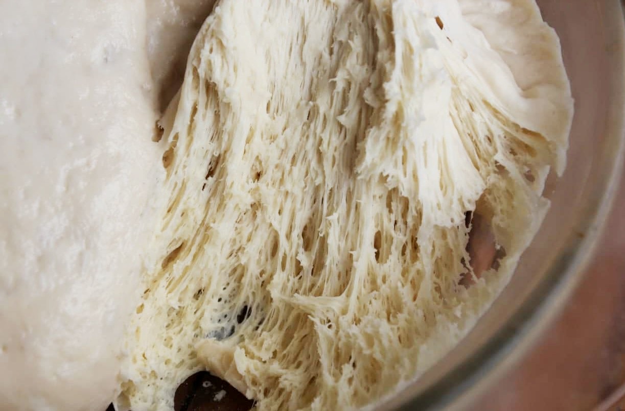 После того как всю воду с дрожжами выльете в тесто и перемешаете, нужно также постепенно добавить воду с солью. Перемешать, пока тесто не соберется в единую массу.