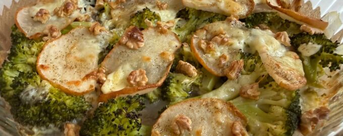 Запеченные брокколи с грушей и сыром – блюдо современной средиземноморской кухни, сочетающее овощи, фрукты, сыры и орехи. Сочетание груши и выдержанного