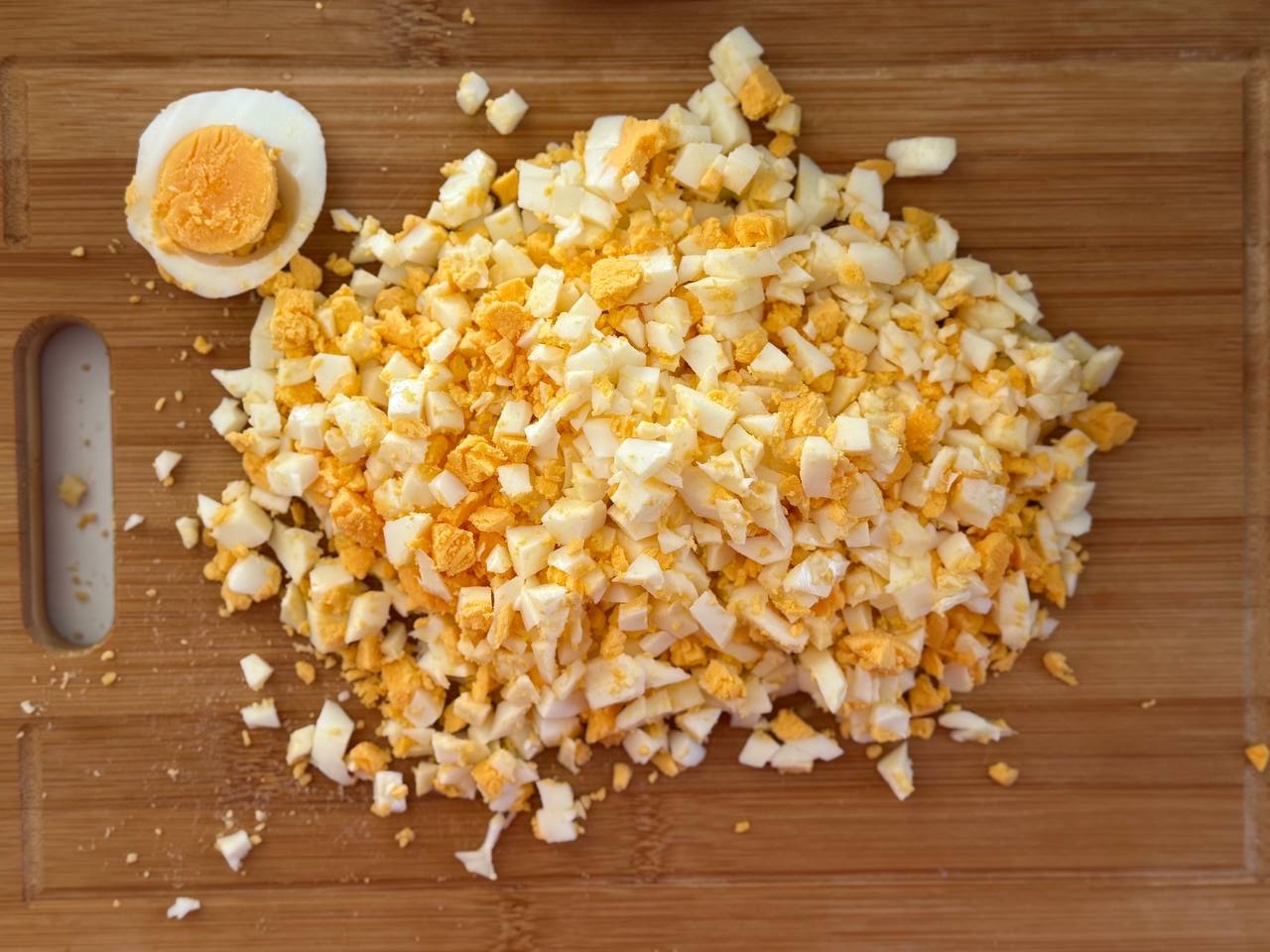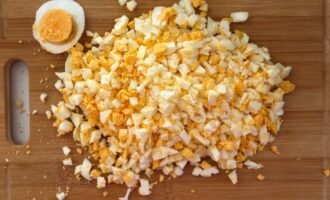 Яйца отварить вкрутую, остудить и нарезать небольшими кубиками.