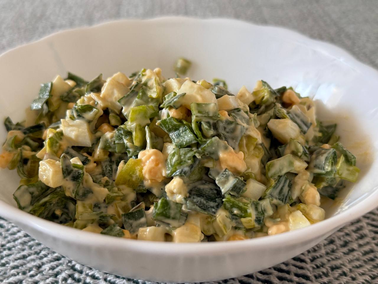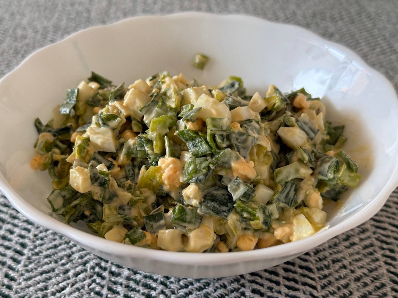 Салат с черемшой не имеет фиксированного рецепта: состав зависит от региона и доступных продуктов. В разных вариантах могли добавляться сметана, масло или простые кислые заправки.