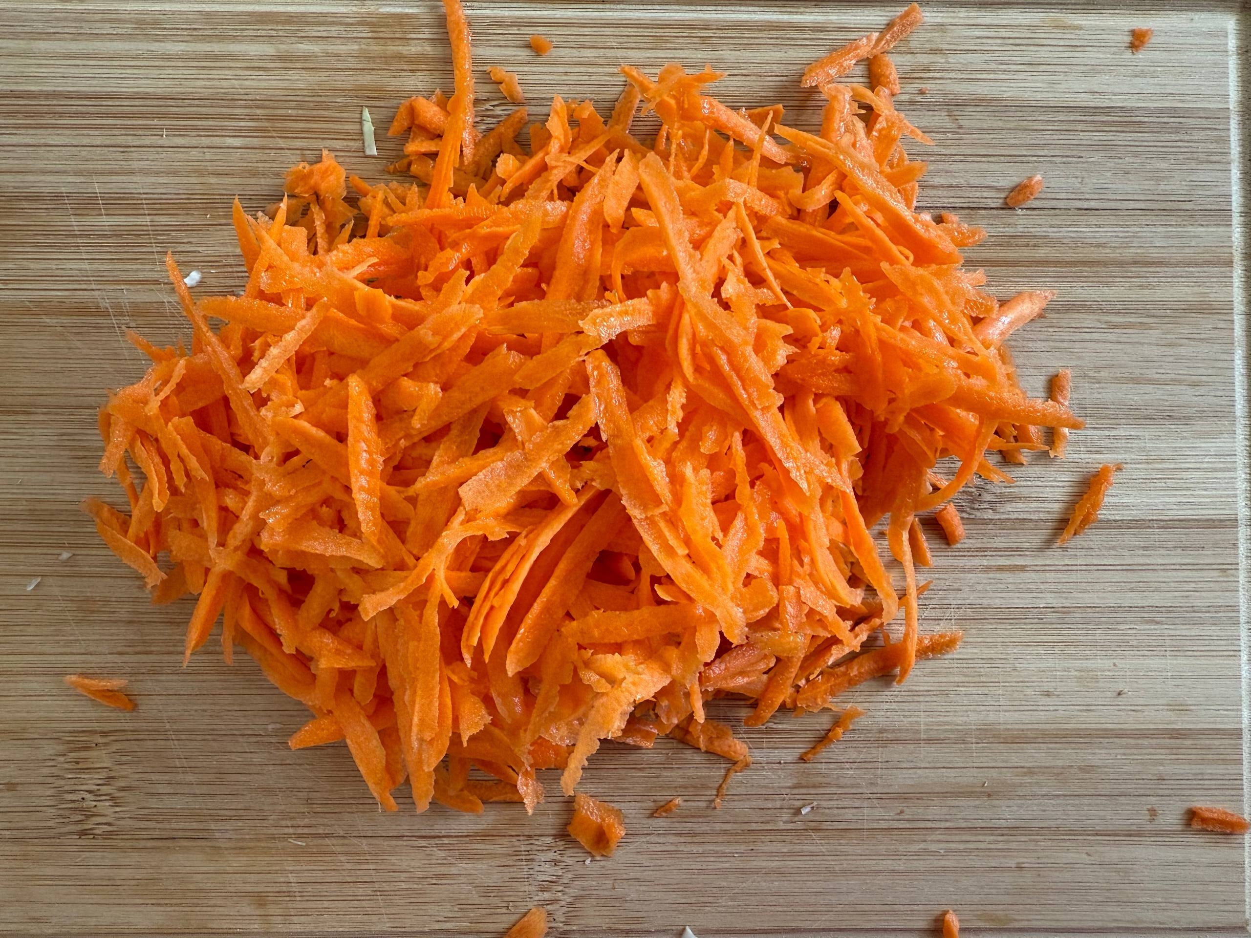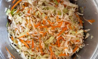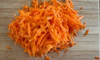 Морковь натрите на крупной тёрке и добавьте к капусте.