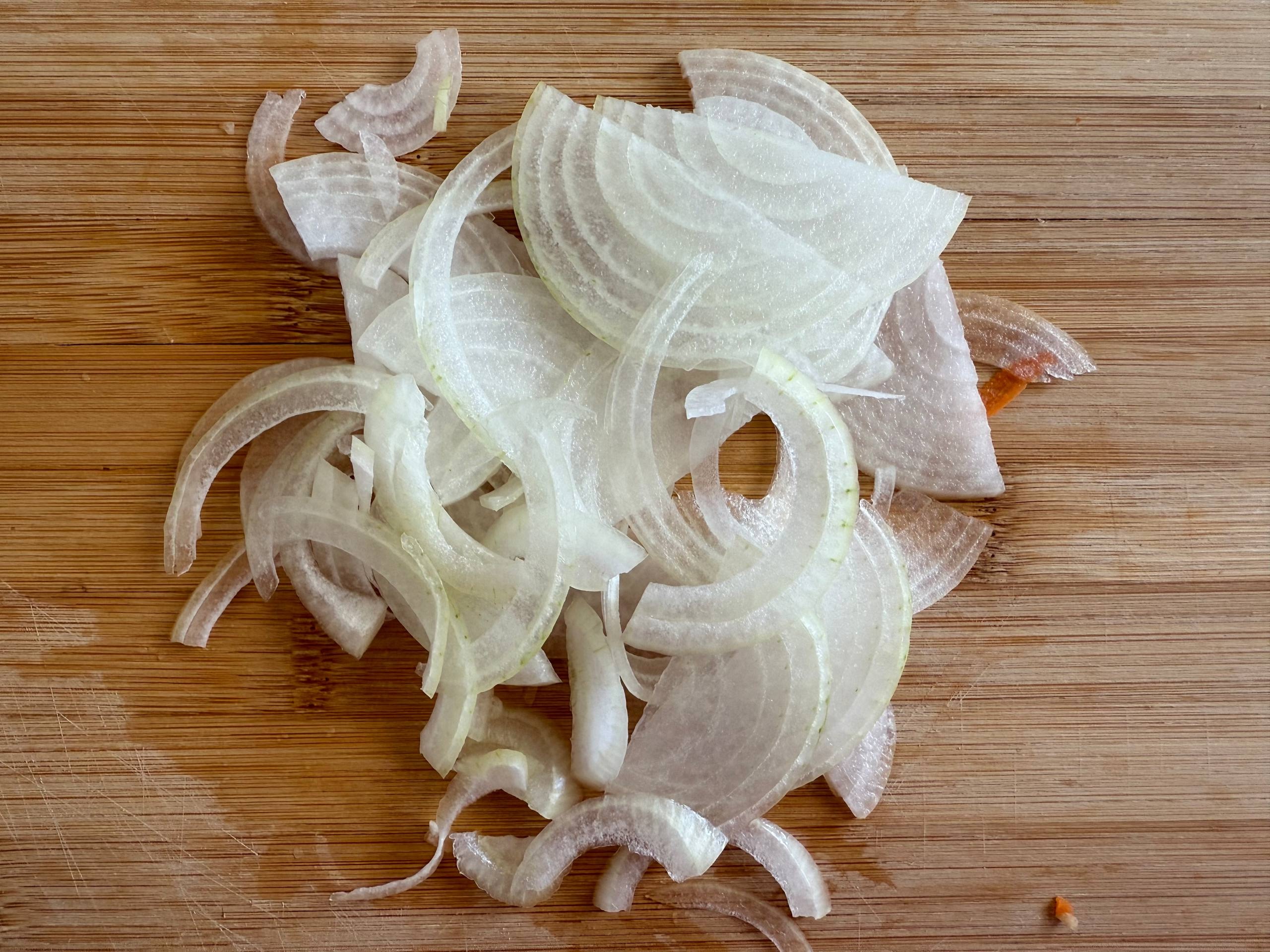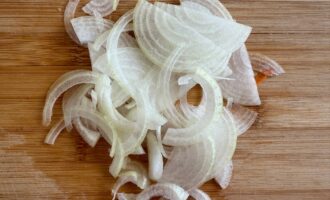 Лук нарежьте тонкими полукольцами и тоже отправьте в миску.
