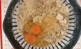 Добавить одно яйцо, хорошо перемешать, замесить тесто и убрать его под плёнку в холодильник минимум на полчаса.
