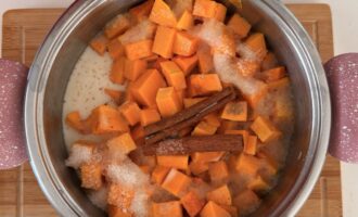В сотейник положить 500 гр нарезанной кубиками тыквы, 250 мл молока или сливок, 100 гр сахара, палочку корицы (её в конце нужно вытащить), ванильный сахар, мускатный орех, молотый имбирь и гвоздику.
