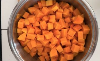 Тыкву очистить от кожуры, семечки удалить при помощи столовой ложки. Мякоть тыквы нарезать на кубики среднего размера.
