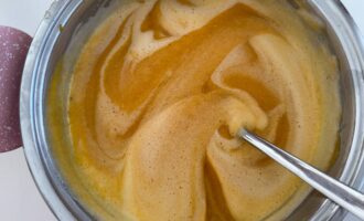 Отдельно взбить одно яйцо и постепенно ввести к нему чуть остывшую тыквенную заливку. Должна получиться красивая однородная масса.
