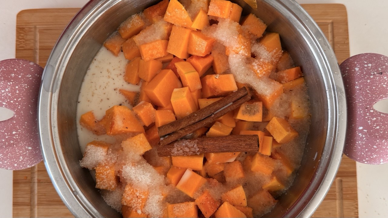 В сотейник положить 500 гр нарезанной кубиками тыквы, 250 мл молока или сливок, 100 гр сахара, палочку корицы (её в конце нужно вытащить), ванильный сахар, мускатный орех, молотый имбирь и гвоздику.