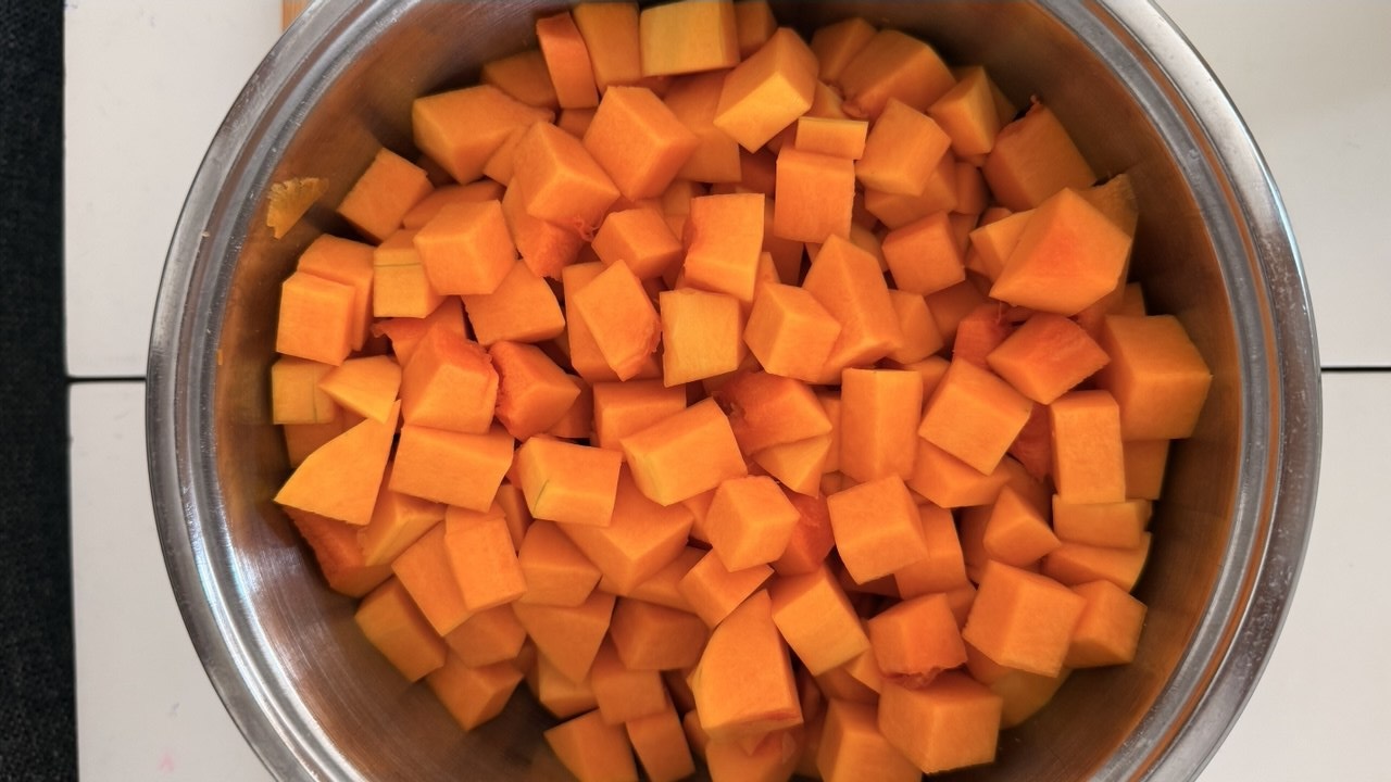 Тыкву очистить от кожуры, семечки удалить при помощи столовой ложки. Мякоть тыквы нарезать на кубики среднего размера.