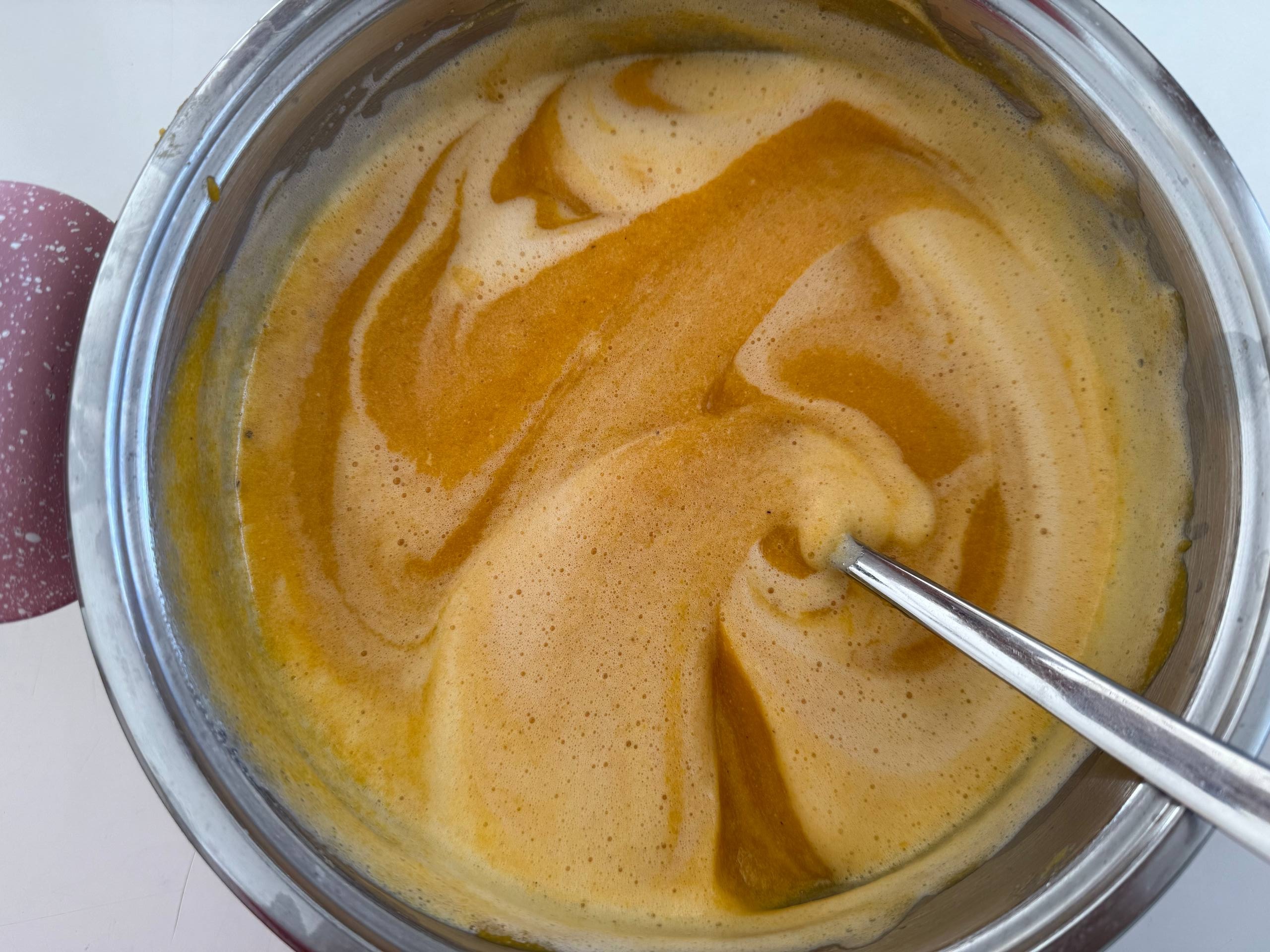 Отдельно взбить одно яйцо и постепенно ввести к нему чуть остывшую тыквенную заливку. Должна получиться красивая однородная масса.