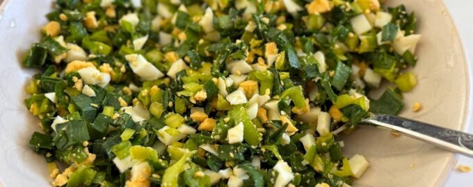 Салат с черемшой – традиционное блюдо восточноевропейской кухни. Черемша с яйцами представляет собой весенний салат из свежей черемши и варёных яиц с простой заправкой.