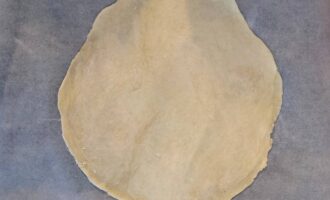• Тесто разделить на две неравные части. Меньшую часть раскатать в круглый пласт и переложить его на застеленный пергаментной бумагой противень.