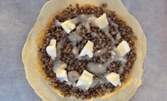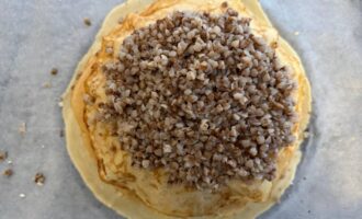 • На блин выложить половину гречневой каши, сверху можно дополнительно положить кусочки сливочного масла.