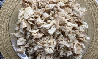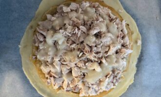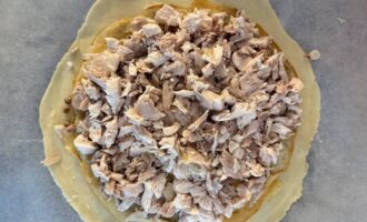 • Далее выложить половину от приготовленной курицы и аккуратно разравнять.