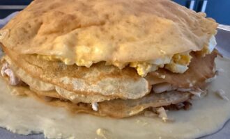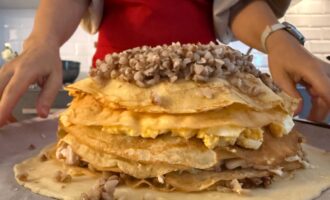 • Выложить слой рубленых яиц, полить соусом и накрыть блином.