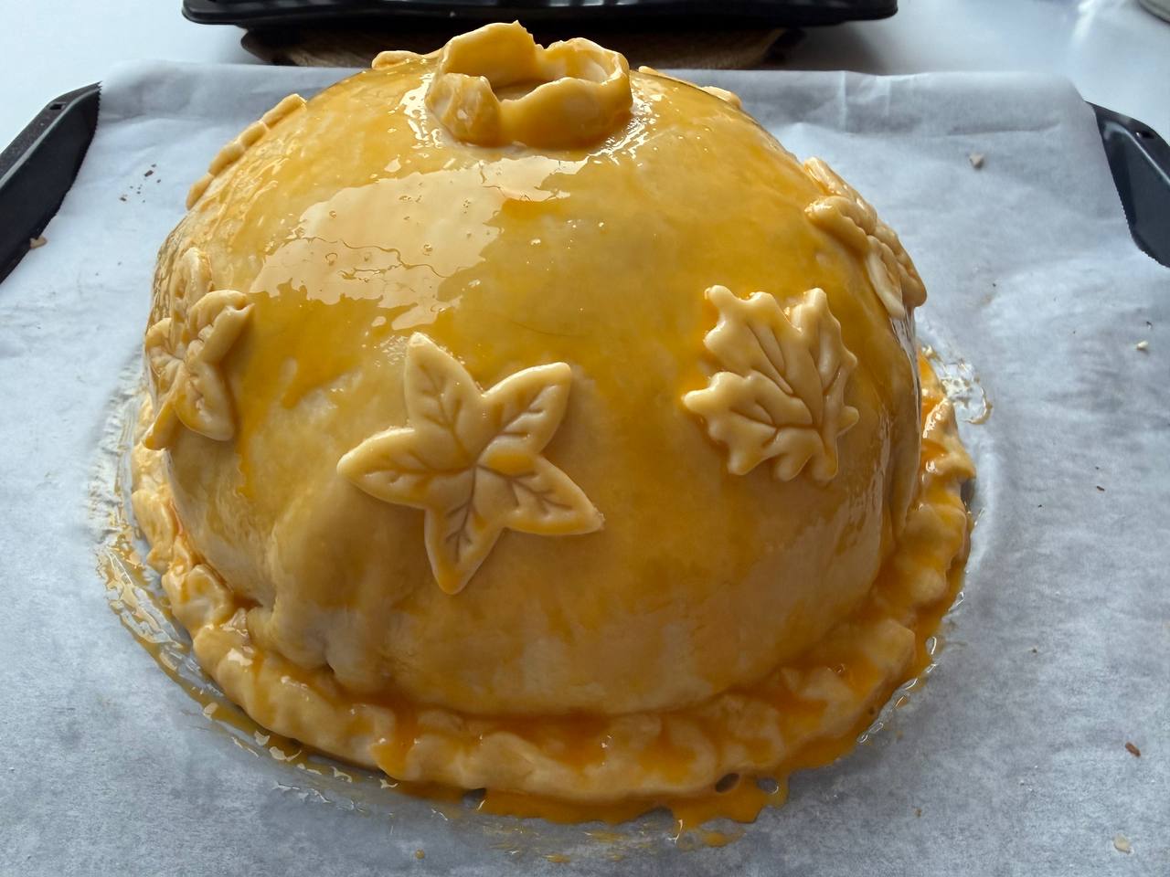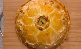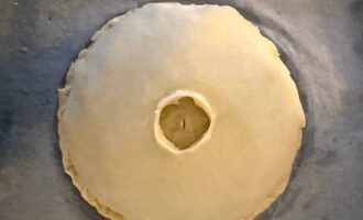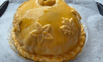 • Оставшееся тесто раскатать и накрыть курник сверху так, чтобы образовался купол. Края тщательно защипнуть, чтобы при выпекании не вытекал бульон.