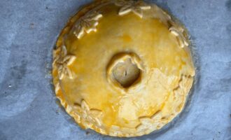 • Сверху в центре сделать небольшое отверстие. Из остатков теста можно слепить небольшие фигурки и украсить поверхность курника.