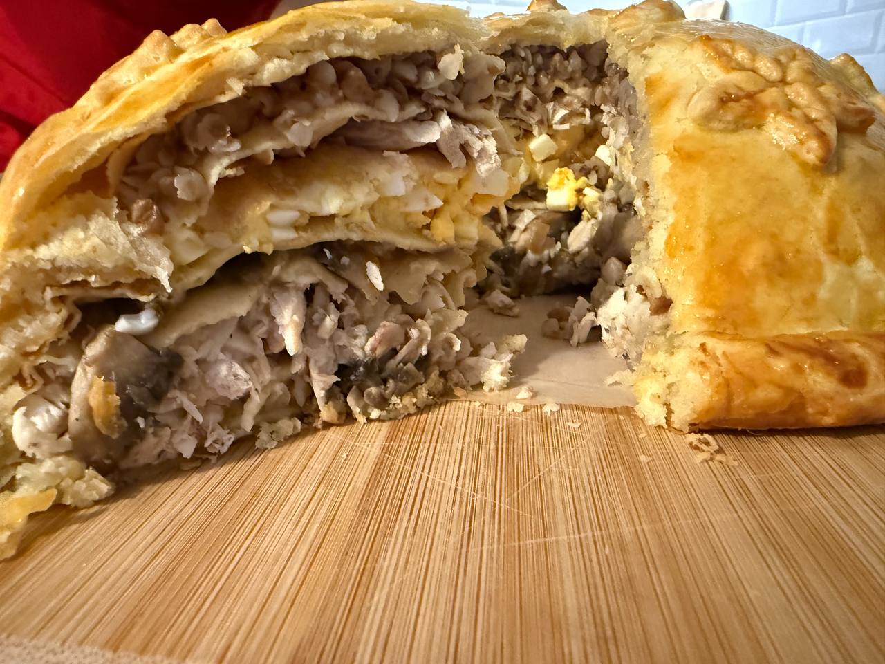 Ниже мы приводим рецепт традиционного курника с начинкой из курицы, гречки, яиц и грибов с луком.