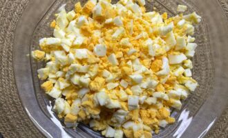• Яйца отварить вкрутую, остудить и нарезать на кубики.