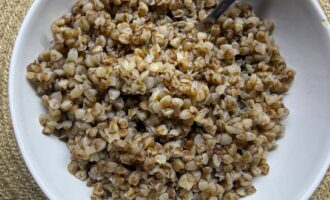 • Гречневую крупу залить холодной водой, посолить по вкусу и довести до кипения. Добавить 50 гр сливочного масла, накрыть крышкой и оставить запариваться, укутав кастрюлю полотенцем.