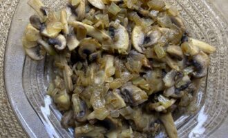 • Грибы и лук нарезать. В толстостенной сковороде разогреть небольшое количество растительного масла. Обжарить лук до золотистого цвета, затем добавить грибы и обжарить до готовности.