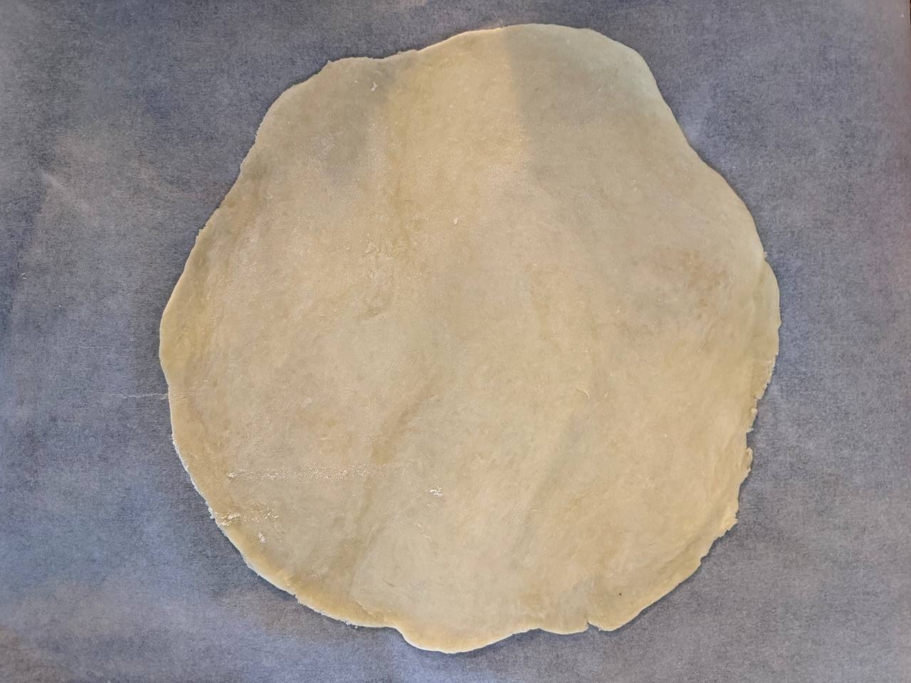 • Тесто разделить на две неравные части. Меньшую часть раскатать в круглый пласт и переложить его на застеленный пергаментной бумагой противень.