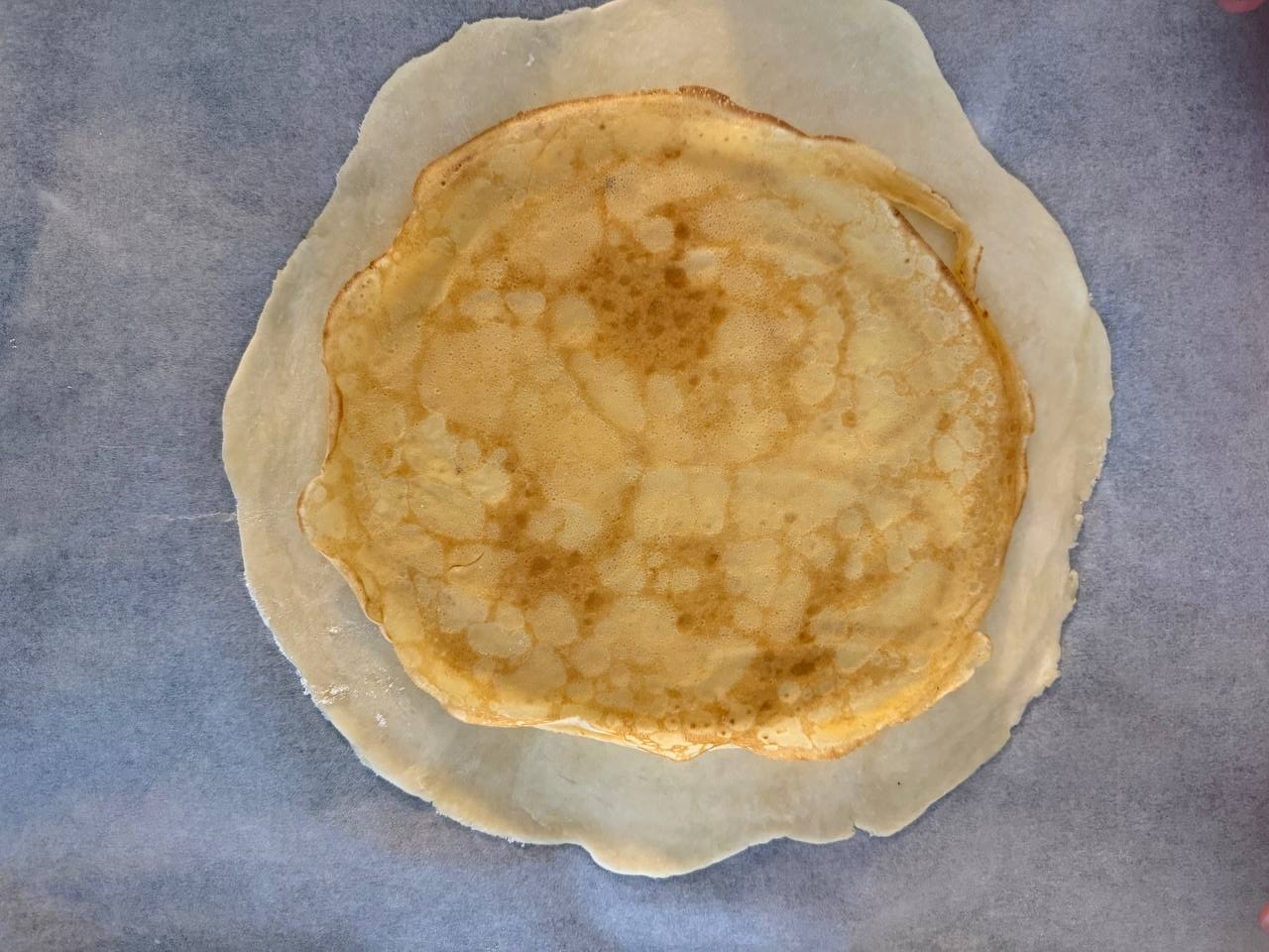 • Поверх теста выложить один блинчик.
