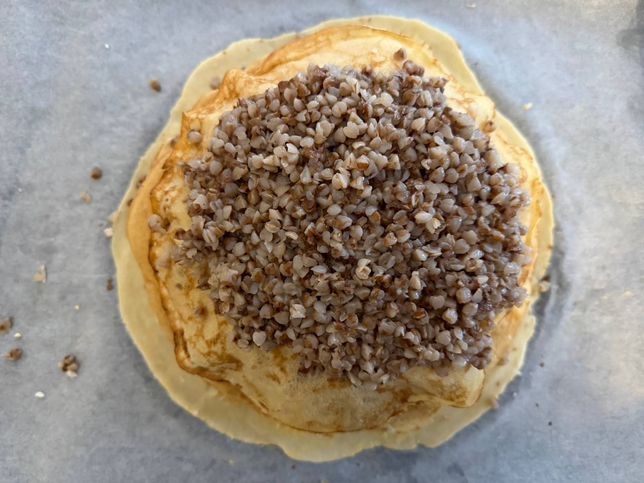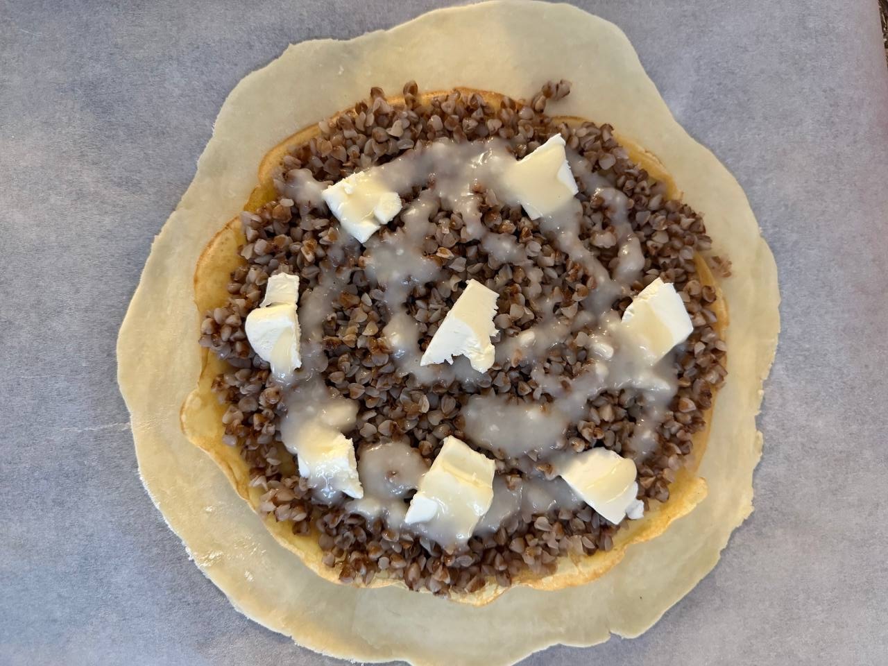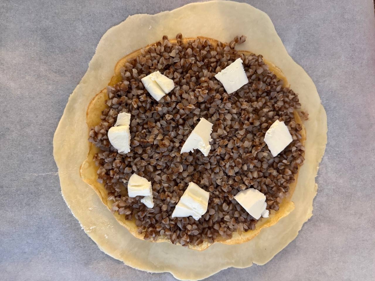 • На блин выложить половину гречневой каши, сверху можно дополнительно положить кусочки сливочного масла.