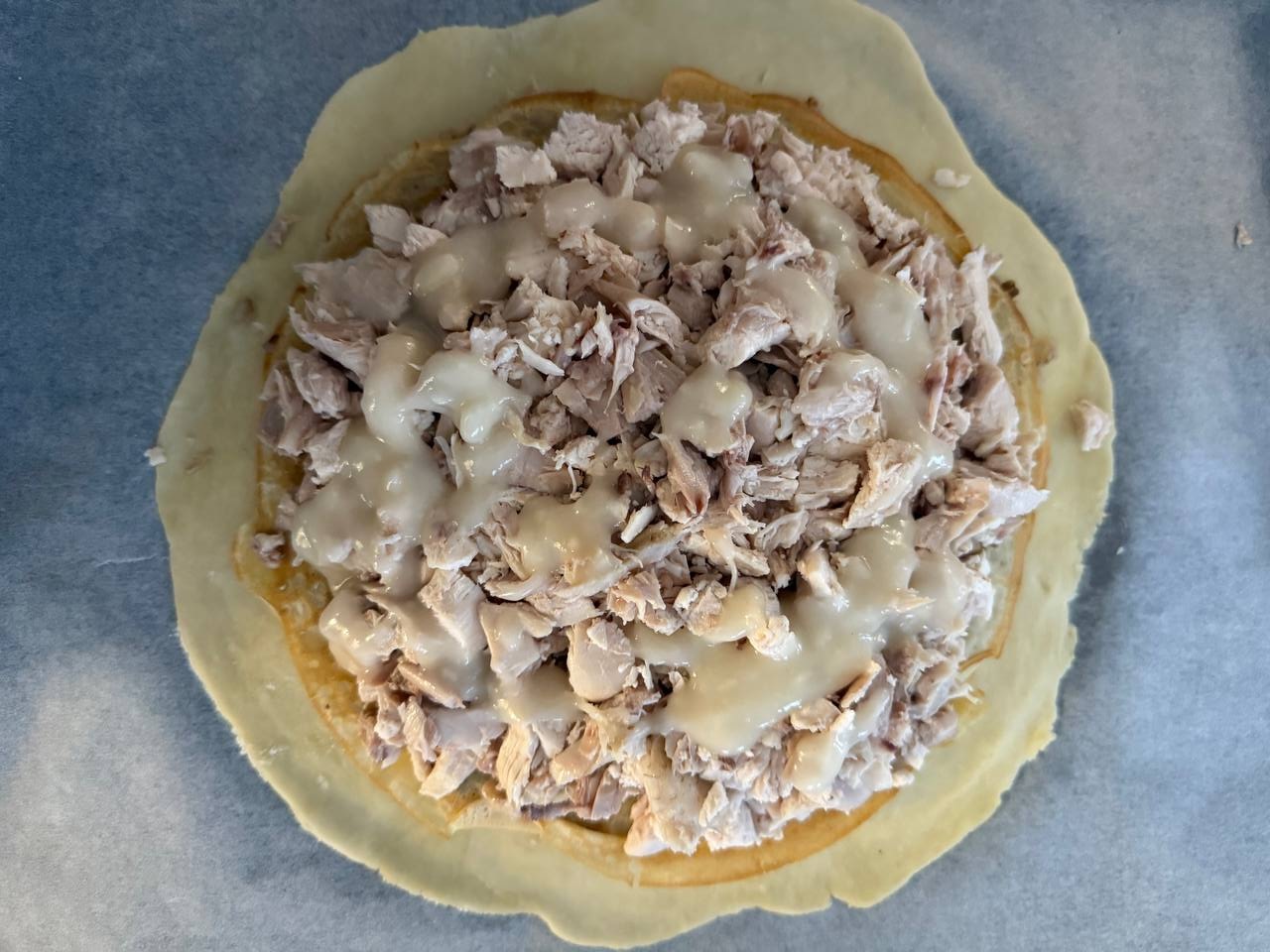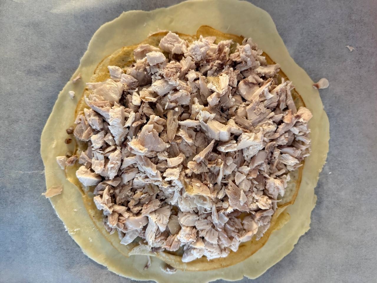 • Далее аналогичным образом выложить оставшуюся курицу, полить 2 ложками соуса, проложить блином и аккуратно разравнять.