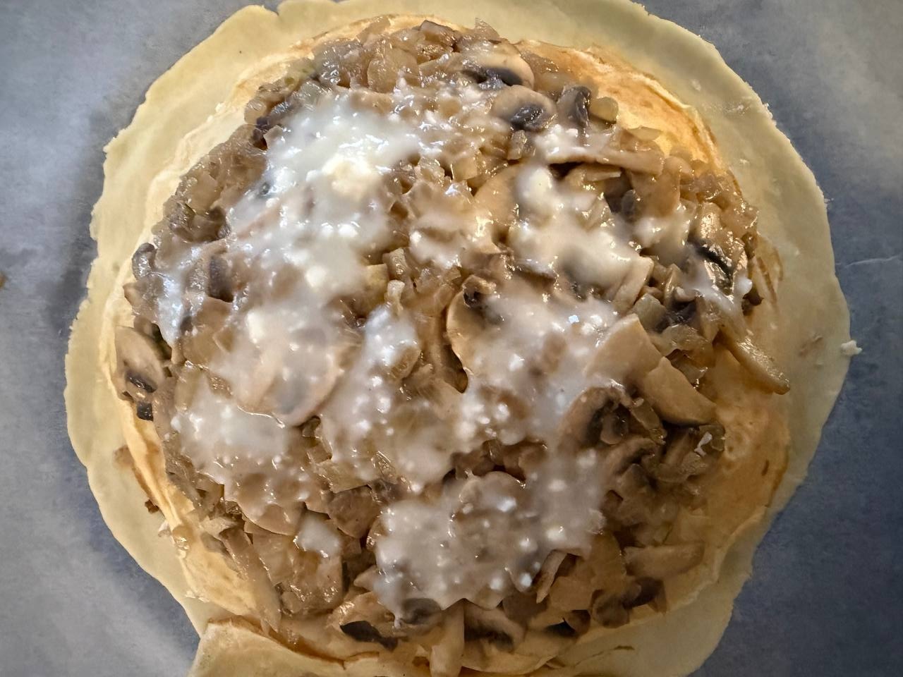 • Выложить начинку из грибов, полить соусом и накрыть блином.