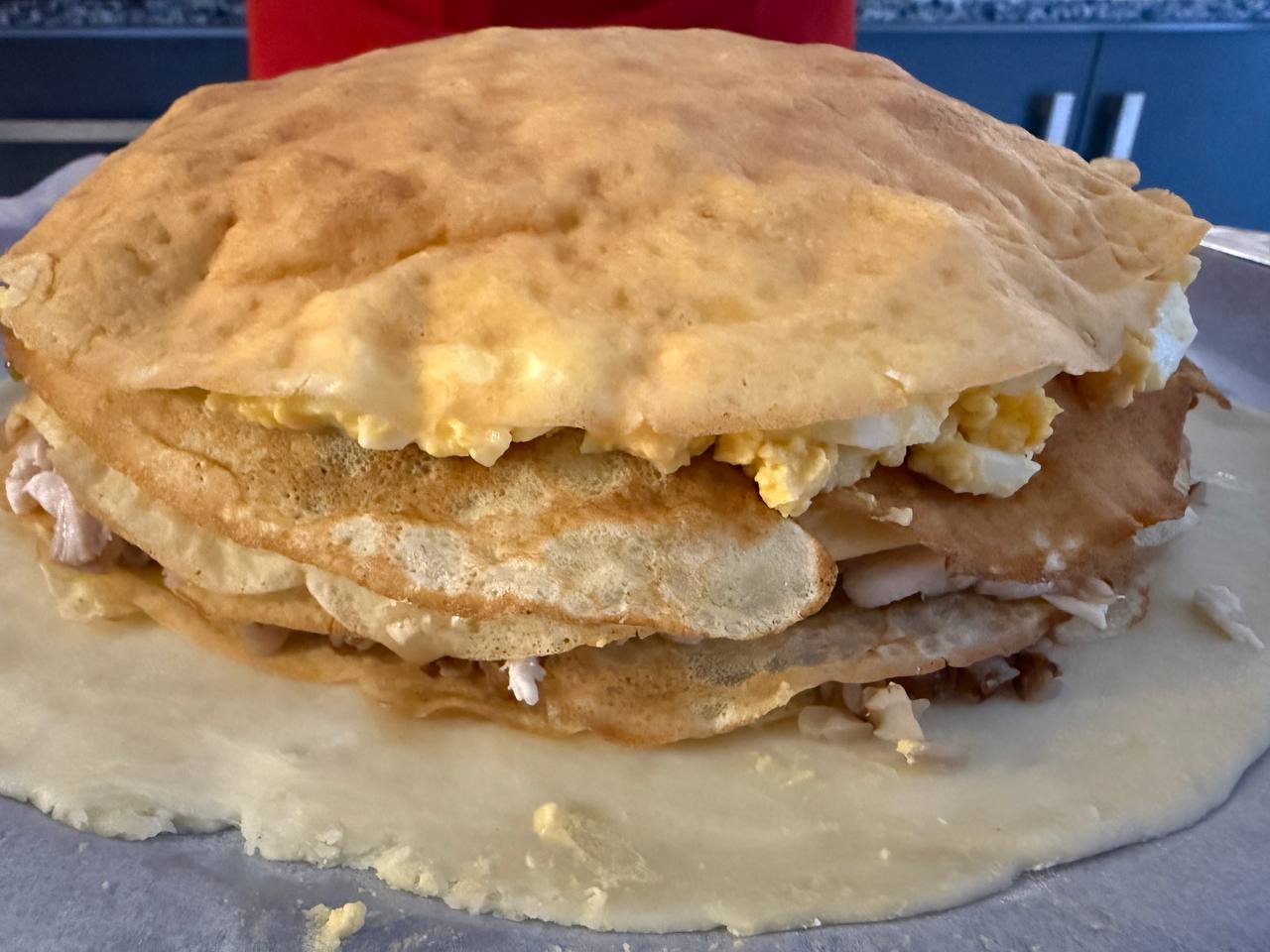 • Выложить слой рубленых яиц, полить соусом и накрыть блином.