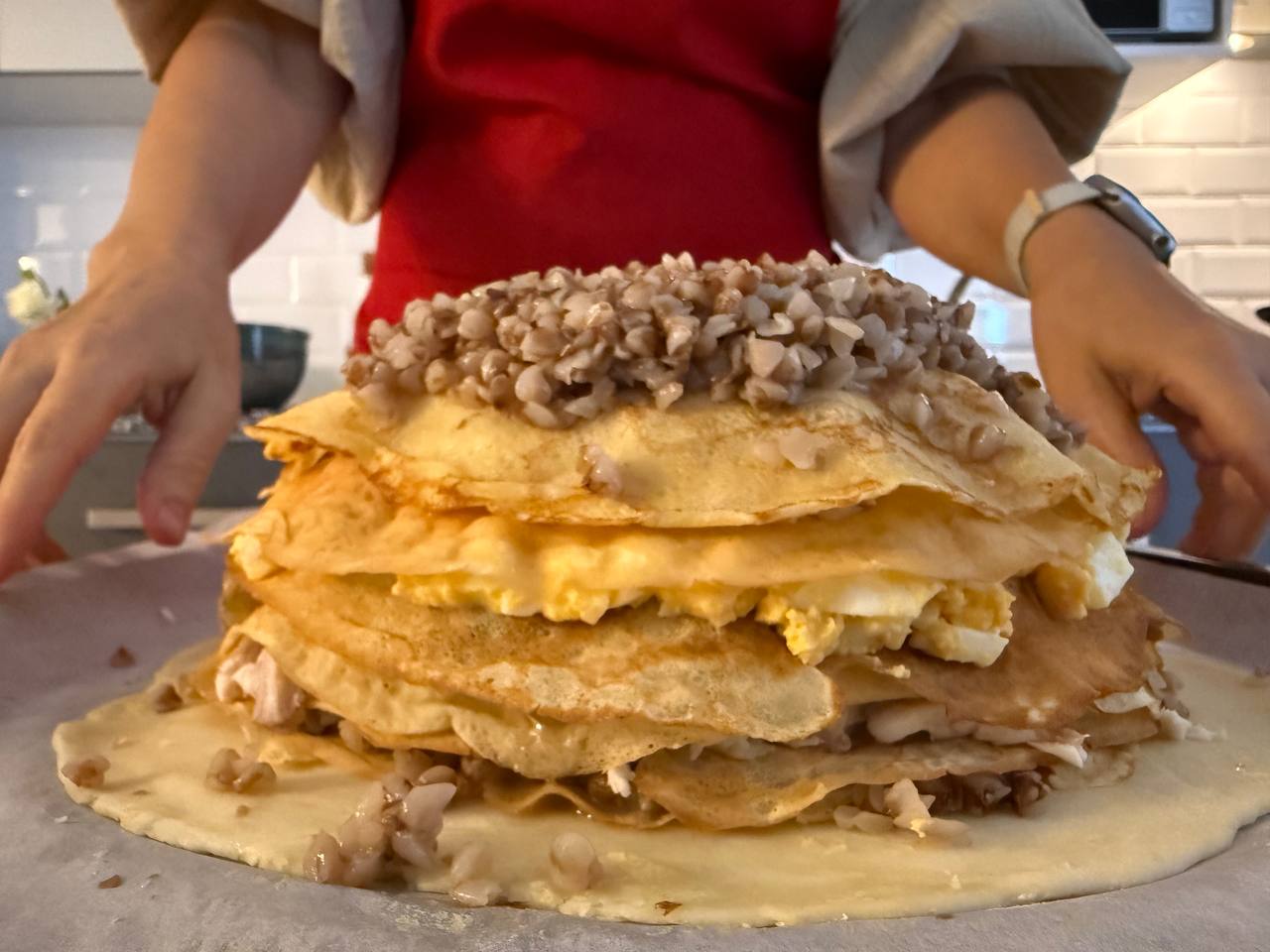 • Сверху выложить оставшуюся гречневую кашу, полить соусом и накрыть оставшимся блином.