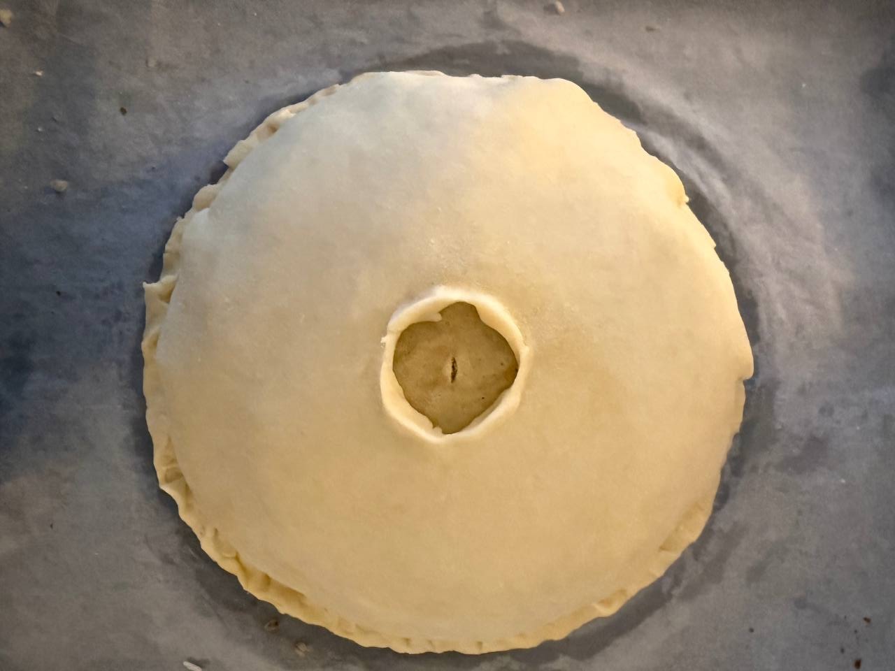 • Оставшееся тесто раскатать и накрыть курник сверху так, чтобы образовался купол. Края тщательно защипнуть, чтобы при выпекании не вытекал бульон.