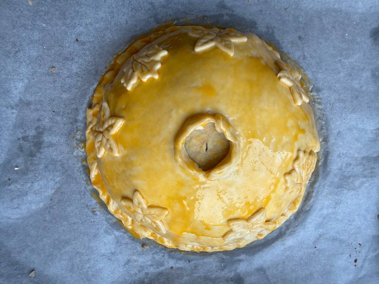 • Сверху в центре сделать небольшое отверстие. Из остатков теста можно слепить небольшие фигурки и украсить поверхность курника.