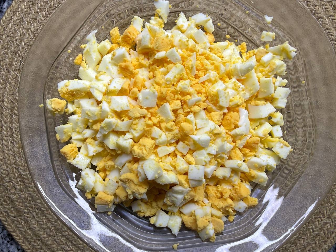 • Яйца отварить вкрутую, остудить и нарезать на кубики.
