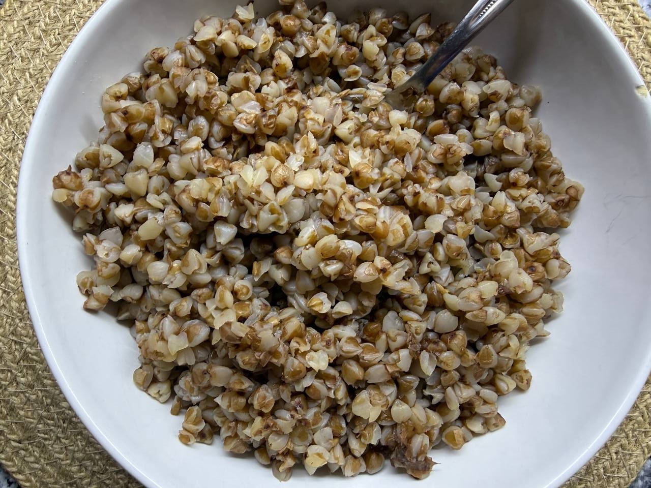 • Гречневую крупу залить холодной водой, посолить по вкусу и довести до кипения. Добавить 50 гр сливочного масла, накрыть крышкой и оставить запариваться, укутав кастрюлю полотенцем.