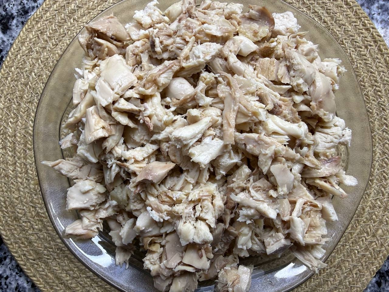 • Курицу отварить до готовности в кастрюле с подсоленной водой. Бульон процедить и перелить в отдельную миску. Курицу отделить от костей, мясо нарезать на куски.
