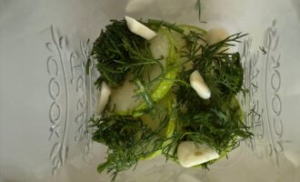 Добавить нарезанный чеснок, укроп, а также черный перец горошком.