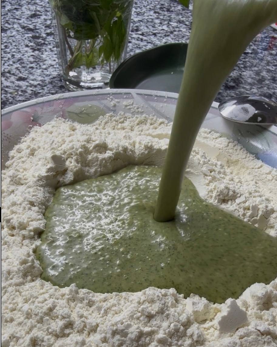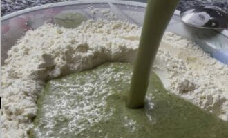 В отдельной миске просейте муку с разрыхлителем и добавьте к мятной смеси.