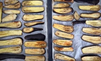 Обрезать у баклажанов хвостики и нарезать их вдоль на полосы толщиной около 1 см. Если баклажаны горчат, то дополнительно нужно их вымочить в соленом растворе (1 ст. ложка соли на 1 воды) в течение 30 минут, а затем промыть и высушить бумажными полотенцами.