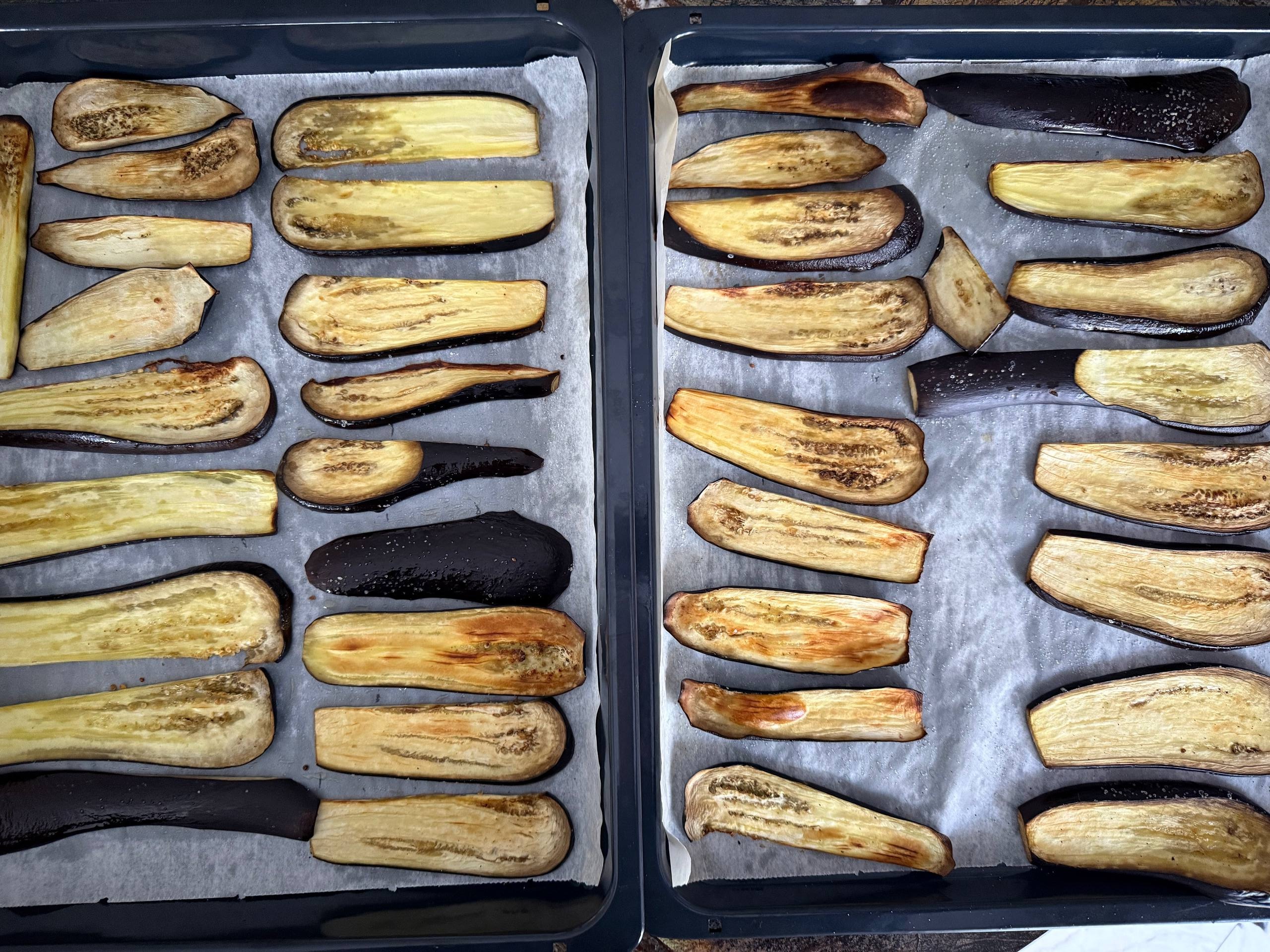 Выложить баклажаны на смазанный маслом противень, сбрызнуть оливковым маслом и посыпать солью. Если вы вымачивали баклажаны в соленом растворе, дополнительно солить не нужно.