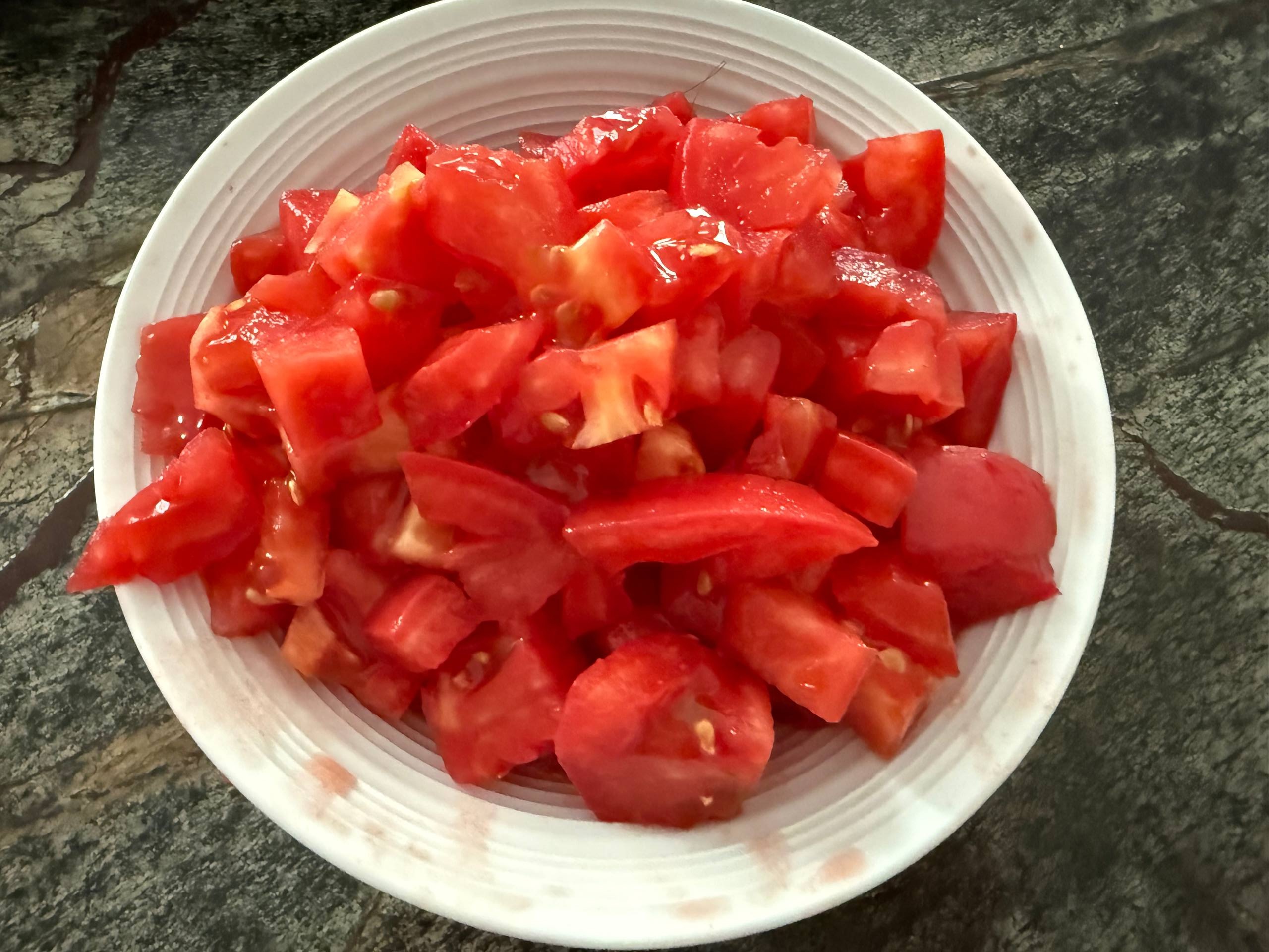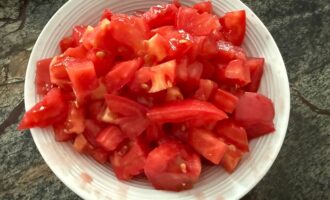 Помидоры очистить от кожицы (это удобнее сделать, если залить их кипятком на 20-30 секунд) и нарезать на кубики.