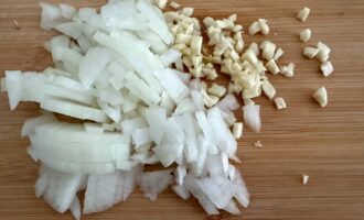 Лук и чеснок мелко нарезать.