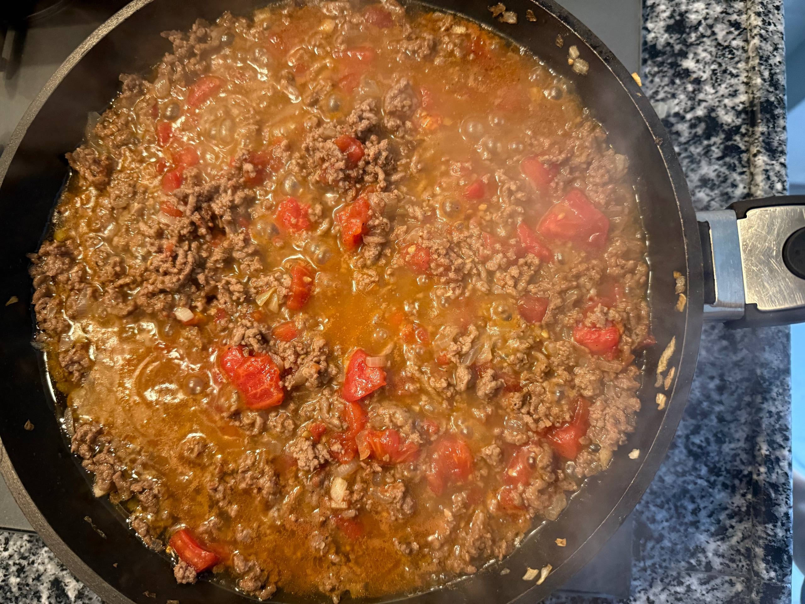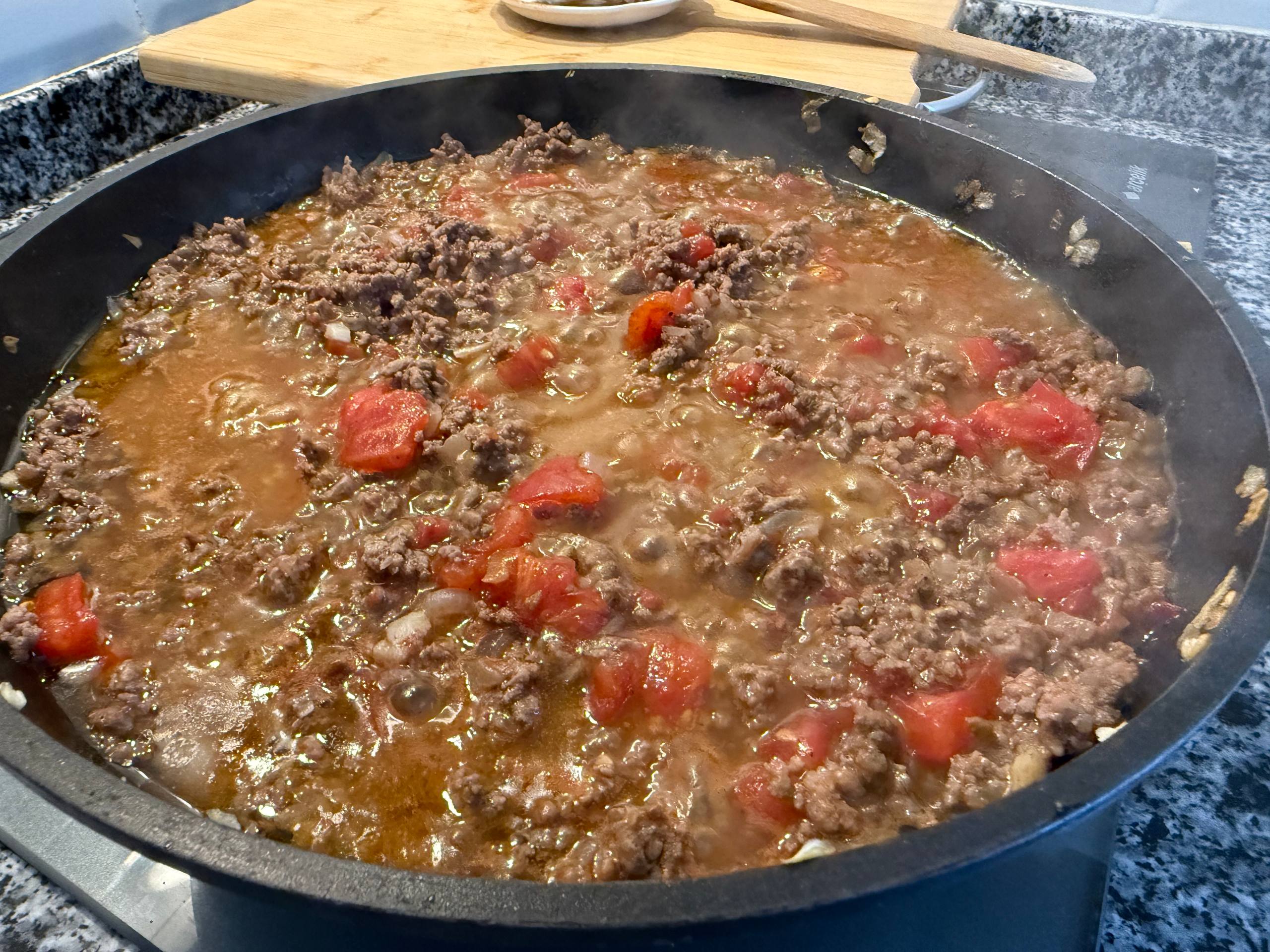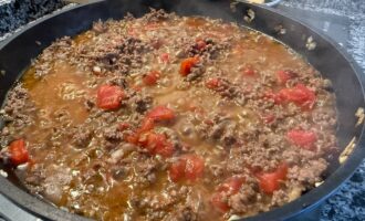 Добавить помидоры, бульон (его можно заменить на стакан кипятка), бульонный кубик, молотую корицу и молотый черный перец. Перемешать.