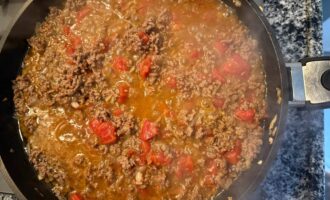 Добавить фарш и жарить еще несколько минут, периодически помешивая, пока фарш не начнет коричневеть.