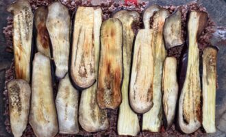 На дно жаропрочной формы выложить половину запеченных баклажанов, равномерно распределяя их по всей поверхности.