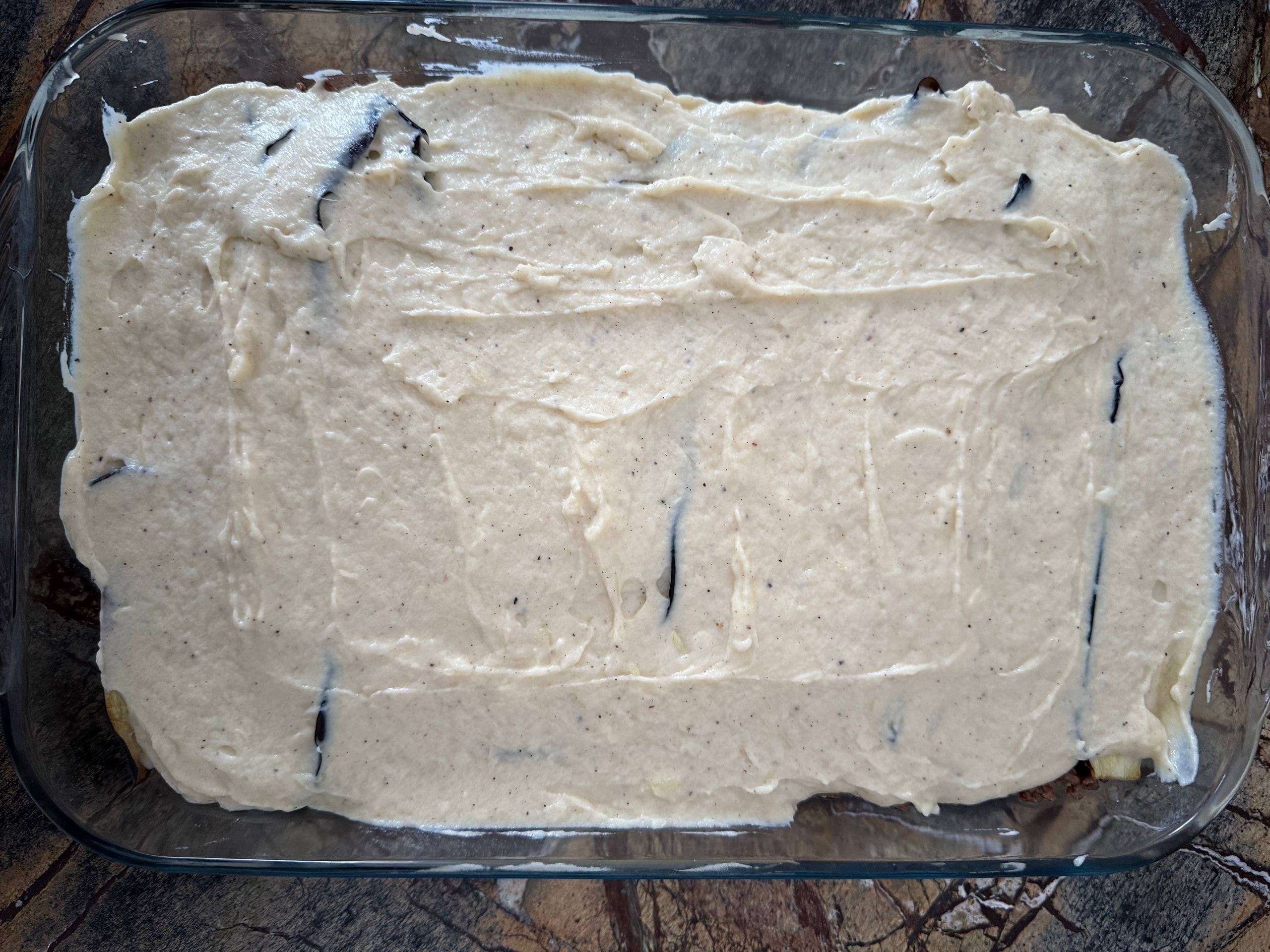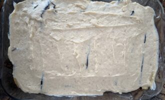Далее выложить весь соус бешамель и равномерно распределить его по всей поверхности.