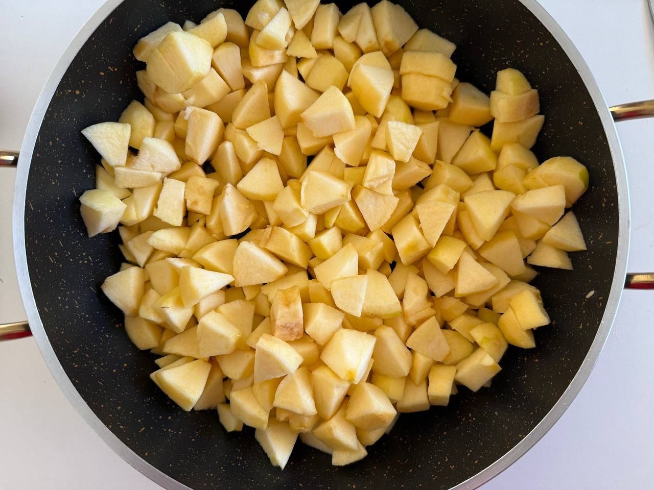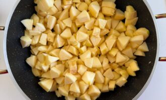 Нарезать на ломтики. Сложить в сковороду, накрыть крышкой и тушить под крышкой на слабом огне, периодически помешивая, в течение примерно 1 часа до мягкости яблок.
