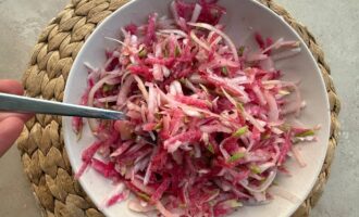Подавайте салат сразу после приготовления, украсив зеленью по желанию. Приятного аппетита!