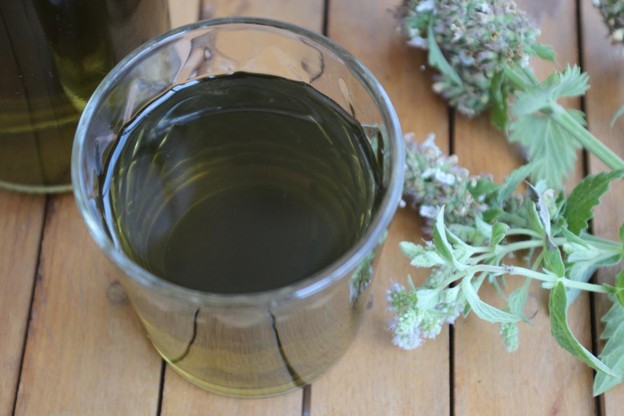 Процедить мятную воду от листьев и налить в кувшин. Добавить сахарный сироп.