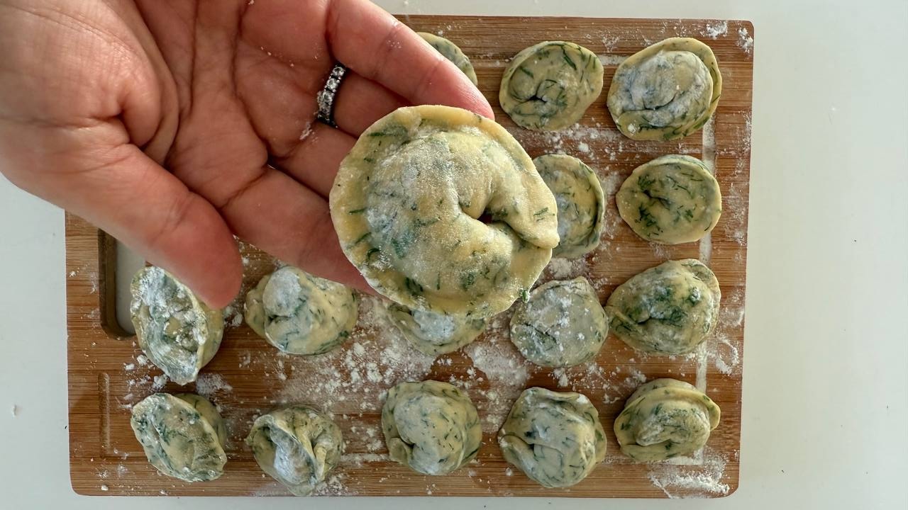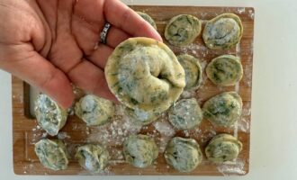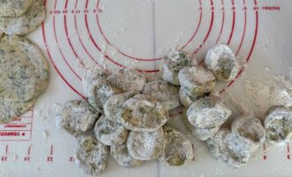 Сложить лепешки и тщательно защипнуть края, формируя пельмени.